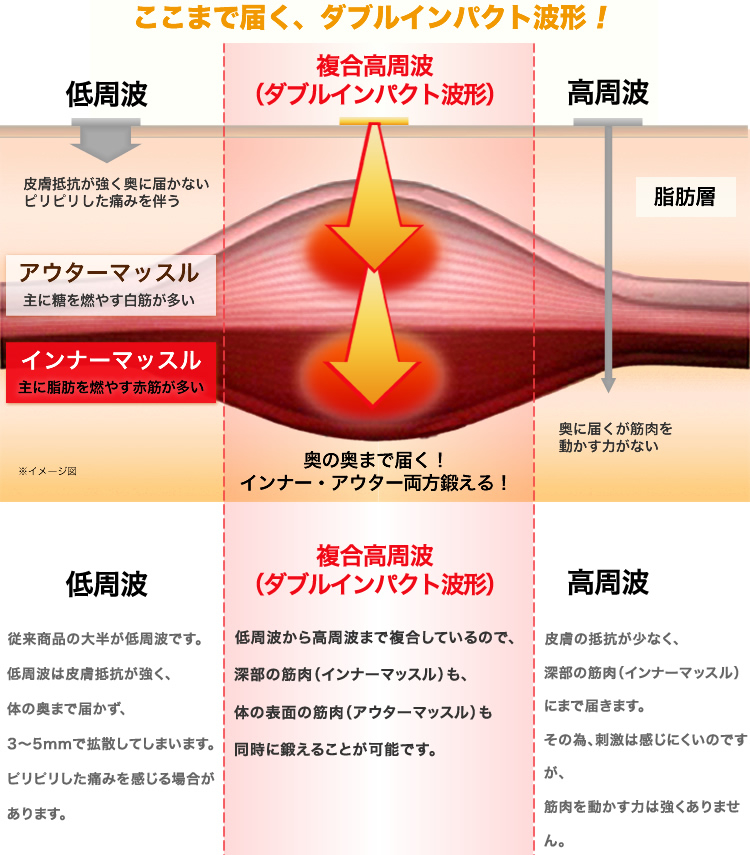 また、従来のEMSでは、皮膚表面2,3ミリしか通電出来ない事が、楽トレは奥深く最大15センチまで届くことが大きな違いです!!