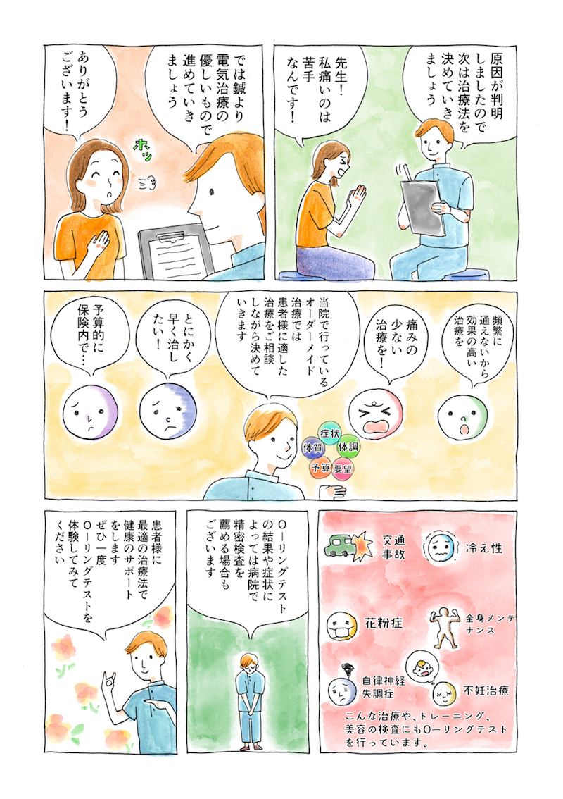 O-リングテストは治療では無く、画期的な診断法です。指で作った輪で開きやすいかどうかで、損傷部位の特定・炎症の有無を見極めます。これにより原因を正確に判断し、治療をすすめ、必要によってはレントゲンやMRI等の検査を薦める場合もあります。