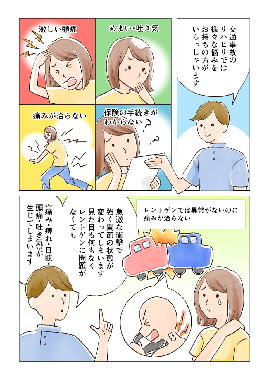 交通事故後の治療についてわかりやすく漫画にしております。